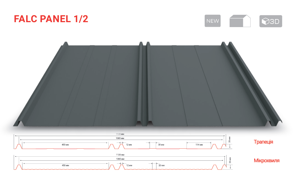 Falc Panel 1/2 — фальцева металева панель з прихованим замком для даху та фасаду. Естетичний вигляд, зручний монтаж, дві форми профілювання: трапеція або мікрохвиля.